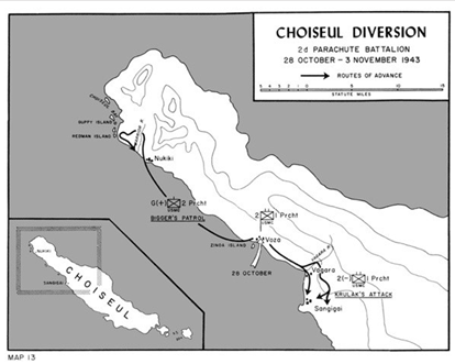 The amphibious raid on Choiseul occurred from October 28 to November 3, 1943. During the raid, Marines from the 2nd Parachute Battalion moved via fast destroyer transports and landing craft to the island, making an unopposed landing with the help of Australian coast watchers and Choiseul islanders. They carried out raids on Japanese army and navy forces across a 25-mile (40 km) area over the course of the next seven days. The force was withdrawn by landing craft following the successful lodgment of U.S. troops on Bougainville.