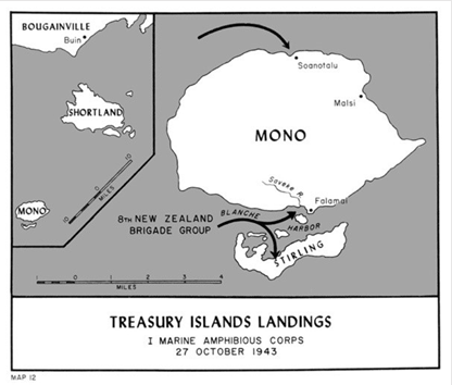The 8th New Zealand Brigade was attached to I Marine Amphibious Corps to conduct the Treasury Islands landings. The brigade was reinforced by about 1,900 Marines, including a signals detachment and liaison section; these Marines provided the New Zealanders with complementary capabilities. The landings began on 27 October and were completed by 31 October against relatively light Japanese opposition. The radar installations and torpedo boat anchorage were quickly established.