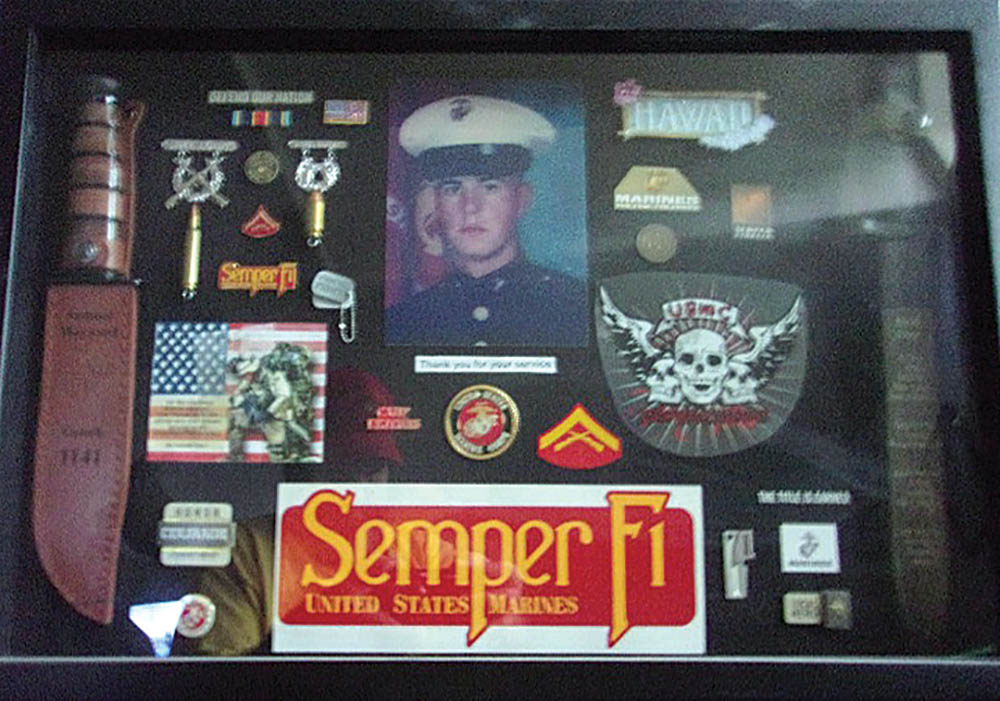 Despite facing health issues he believes are connected to the water contamination at Camp Lejeune, Sam Maynard takes great pride in having served in the Marines. A shadowbox of mementos from his time in service is displayed prominently in his home.