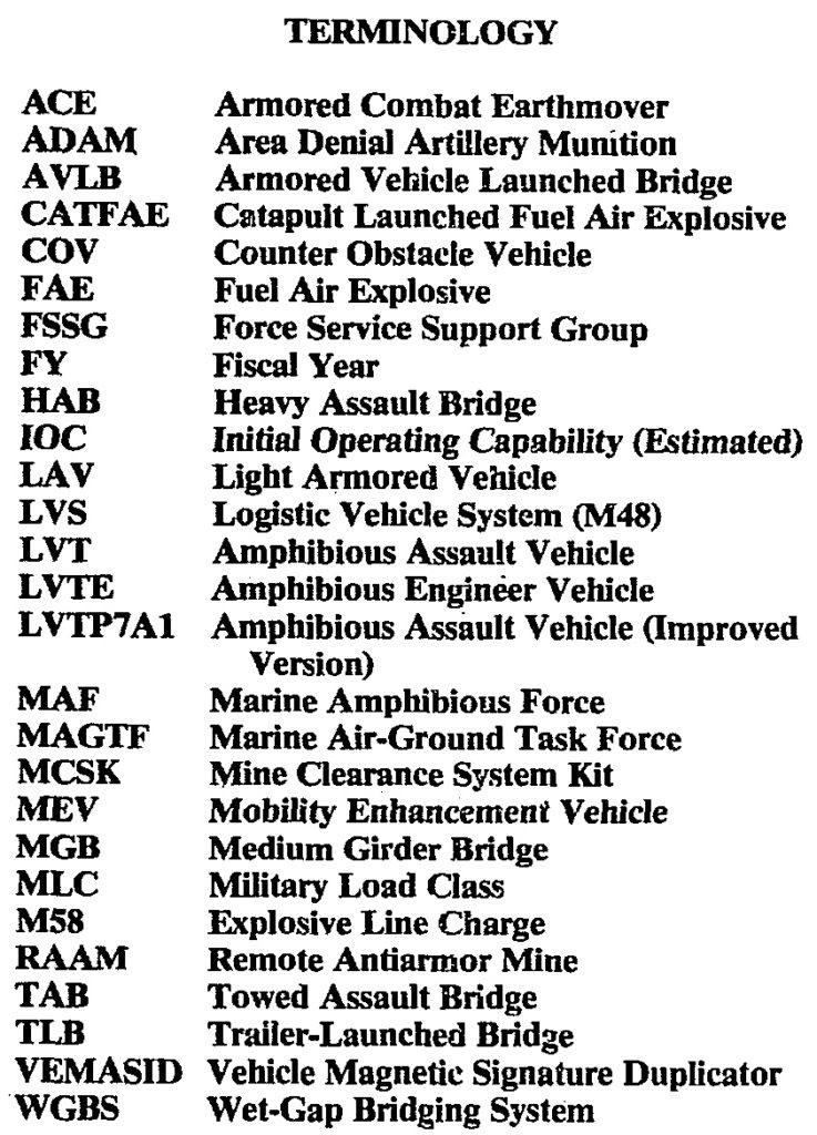 Of all the challenges facing the Marine Corps as it strives to improve its capabilities to fight on the modern battlefield over the next 5-20 years, none is greater than the need to improve battlefield mobility and survivability. Although in recent years the Marine Corps has acquired new mechanized/vehicular systems, improved firepower systems, and better aviation capabilities-all of which contribute to better ground mobility-no corresponding improvements have been made, nor are adequately planned, for the ancillary equipment needed to make any mobility improvement a reality. Consequently, the Marine Corps does not possess the proper balance of equipment and operational capabilities required for a credible amphibious force projection capability. This weakness will be especially harmful during subsequent operations ashore when a maneuver style of warfare must be waged.