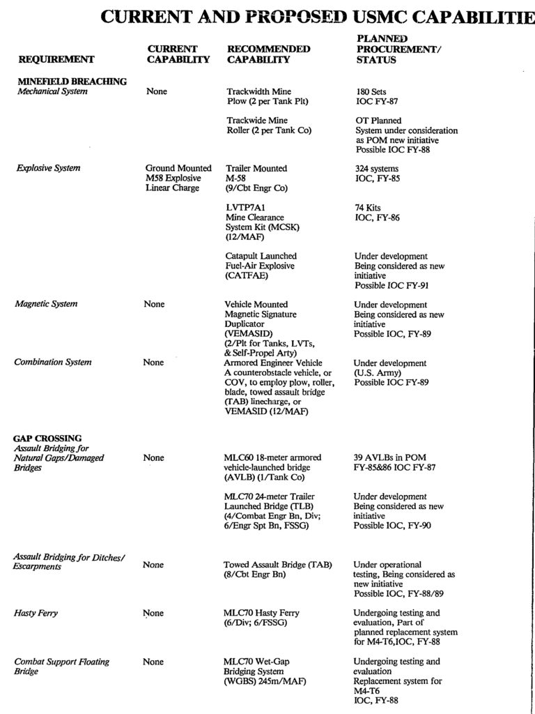 For the Marine Corps to achieve its concept of employment in the mid- to long-range period, a major commitment must soon be made for procurements to rectify the existing deficiencies in mobility and survivability enhancement systems. Figure 2 contains descriptions of the items needed and the status of their acquisition. These capabilities are discussed further in the paragraphs below: