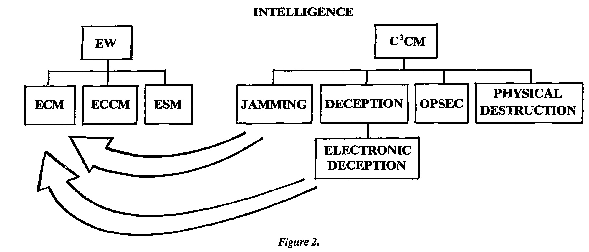One significant obstacle to a clear understanding of C^sup 3^CM is that as a strategy, it is often confused with electronic warfare. Elements of EW are included in C^sup 3^CM-jamming and electronic deception (Figure 2)-however, EW is a discipline in its own right, just as communications, logistics, and intelligence are separate disciplines. C^sup 3^CM is not a separate discipline; it is a strategy that the commander uses to integrate the uses of various techniques and weapons. This is an extremely important distinction to make because too often the terms are blended together and become synonymous. This leads to misleading terms such as “C^sup 3^CM hardware,” “EW/C^sup 3^CM,” “C^sup 3^CM officer,” “C^sup 3^CM conditions,” and “hostile C^sup 3^CM environment.” C^sup 3^CM hardware could be artillery, iron bombs, jammers, direction finders, or practically anything else including a bayonet, depending upon how the equipment is being used at the time. Consequently, it’s really a meaningless phrase. EW/C^sup 3^CM is a term used extensively by those in the electronic warfare community and, in fact, this group has been the main proponent of C^sup 3^CM. They recognize our increasing dependence on electronics for communications, information sorting, acquisition of targets, and for guidance systems. To quote Gen Trainor again, “Astute use of electronics in all its forms in conjunction with superior intelligence and operational security can practically deliver the enemy into the commander’s hands for the death blow.” Electronics is utilized in all the aspects of C^sup 3^ and is an important element of our intelligence systems that are required to support C^sup 3^CM. However, to try to turn C^sup 3^CM into a separate discipline ignores the fact that it involves every functional area of military operations.