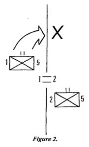 (Col Pestke took the sketch.) If the 1st Battalion has this opportunity, it should take advantage of it. Remember that each battalion commander knows the intent of the brigade commander. He will try to inform the 2d Battalion if he is crossing the boundary, but the most important thing is that he does not miss an opportunity. (Col Pestke drew an “X” in 2d Battalion’s zone of action as shown in Figure 2). Now, if the 1st Battalion enters this zone and is here (at X) I ask you, who is responsible for controlling fires here? The answer is that now it must be the 1st Battalion. We have a principle. Whoever can observe the fire