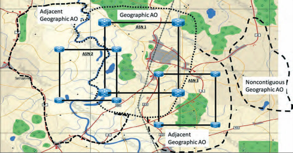 Using the inherent boundaries depicted above, cyberspace can be broken down into areas of operations (AOs) and assigned to military commanders, who can conduct supporting operations to military actions within their geographic AO. In joint doctrine, the joint force commander assigns AOs to his subordinates as a means to enable subordinate commanders to “accomplish their missions … and protect their forces.”8 Similarly, in cyberspace, a cyber-AO (C-AO) may be defined as the logical space and physical routing devices, transmission paths, and network components which may impact the applicable geographic AO. The starting point for defining the C-AO is to determine which ASNs impact the geographic AO. By listing these ASNs, one may understand the larger inter-domain routing pathways that impact the physical AO. The ASNs, which communicate via border gateway protocol, essentially become the outer boundary of the C-AO. Border gateway protocol ıs a path vector protocol, which means that it maintains a specific path for data flow. This is particularly useful in establishing the C-AO because a reading of the protocol at a given point allows one to infer which ASNs connect to the ASNs that directly impact the geographic AO. The associated IP space confining these ASNs makes the first element in the C-AO. (See Map 1.)