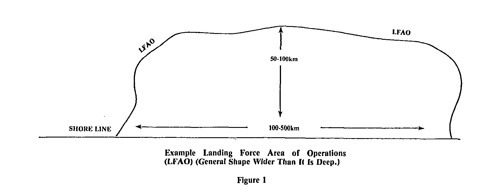 * The shape and size of the LFAO should be influenced by maneuver warfare concepts. Obviously, the size will vary significantly between different types’ of missions, threat forces, and between different-sized MAGTFs. However, it is believed the general shape will be constant; that is wider than it is deep. There are many reasons for this, but the primary ones relate to the umbilical cord to the sea. The Navy portion of the amphibious task force (ATF) remains a vital part of the maneuver concept and capability throughout the operation. Deep inland thrusts stretch the umbilical cord to a point where the landing force ashore becomes ineffective no matter what tactics are employed. However, operations along the littoral do not stretch the cord. They take full advantage of assets at sea such as naval gunfire (NGF), LCACs, and helicopters. (See Figure 1.)