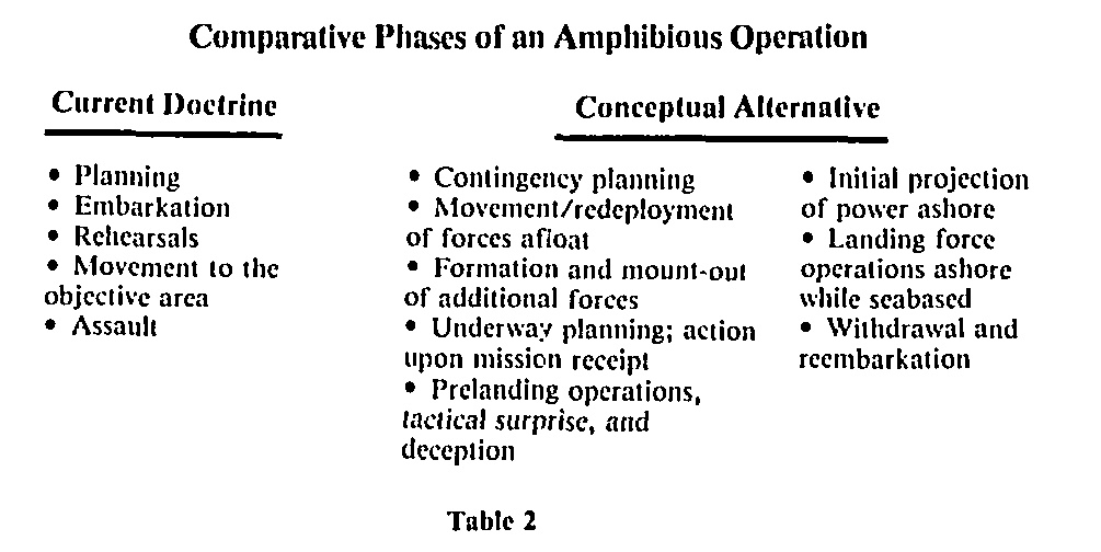 * Rehearsals after receipt of the forcible entry mission are to be avoided if possible. Exceptions to this general principle would be rehearsals to deceive the enemy. For a comparison of potential phases of future amphibious operations with contemporary phases, see Table 2.