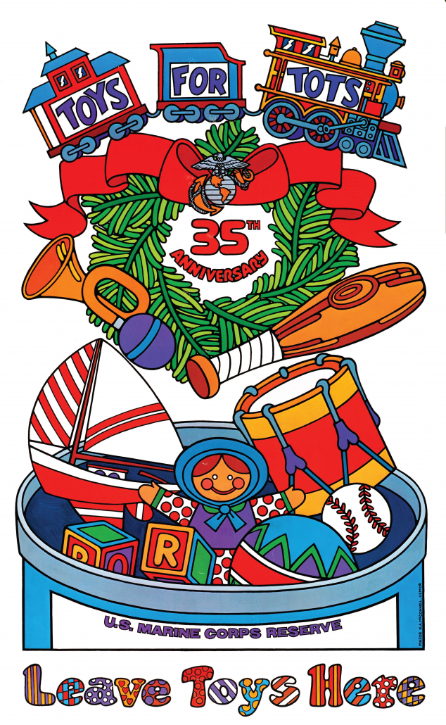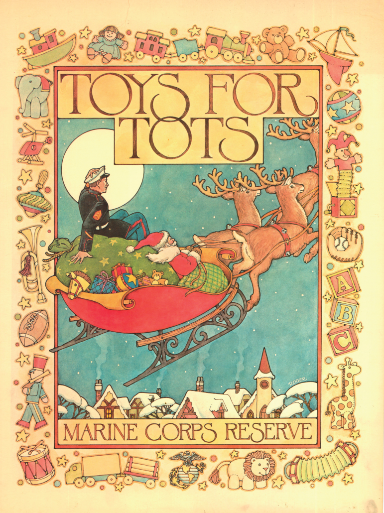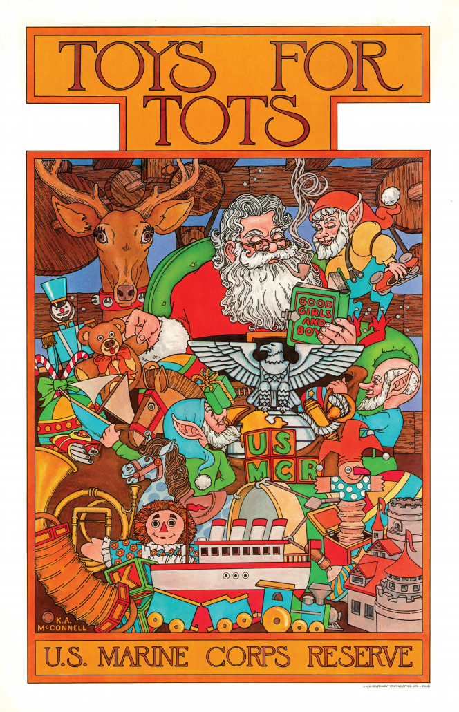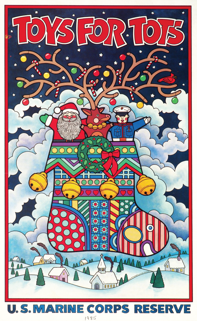 Of the many artists responsible for creating iconic imagery for Toys for Tots, Marine Corps combat artist Keith McConnell is of exceptional note. He designed nine posters for Toys for Tots including for the 35th, 50th, 60th and 70th anniversaries. McConnell served as a combat artist during the Vietnam War and during Operation Desert Storm. Following his service in Vietnam, he went on to illustrate children’s books and medical texts.