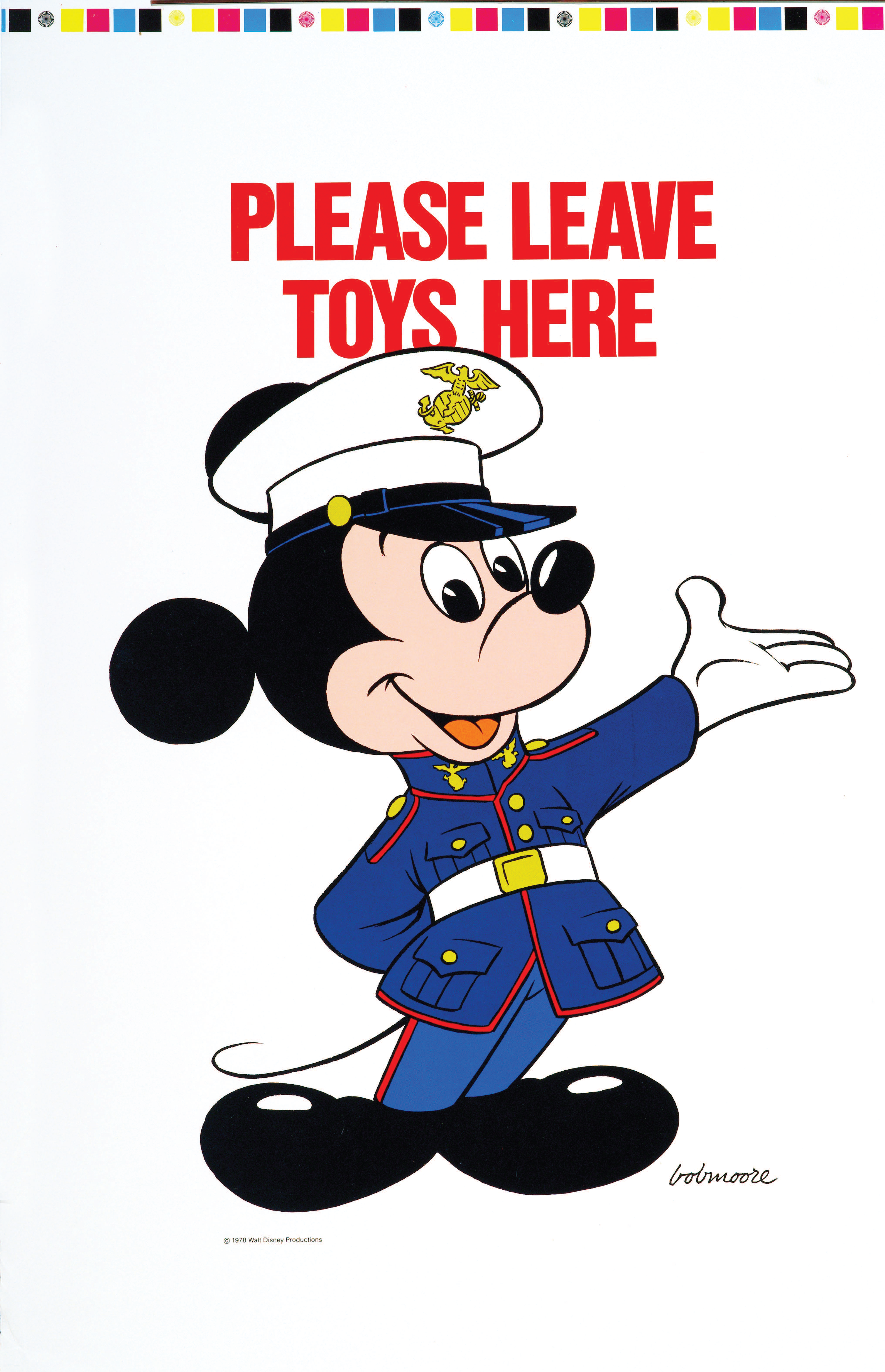 Bob Moore is another notable artist who designed a Toys for Tots poster. A cornerstone of early Disney animation, Moore was a liaison to the U.S. military, producing special projects for the U.S. government during World War II. He designed the Mickey Mouse-themed poster for the 1978 Toys for Tots campaign. The National Museum of the Marine Corps collection contains an original galley proof of the special poster.