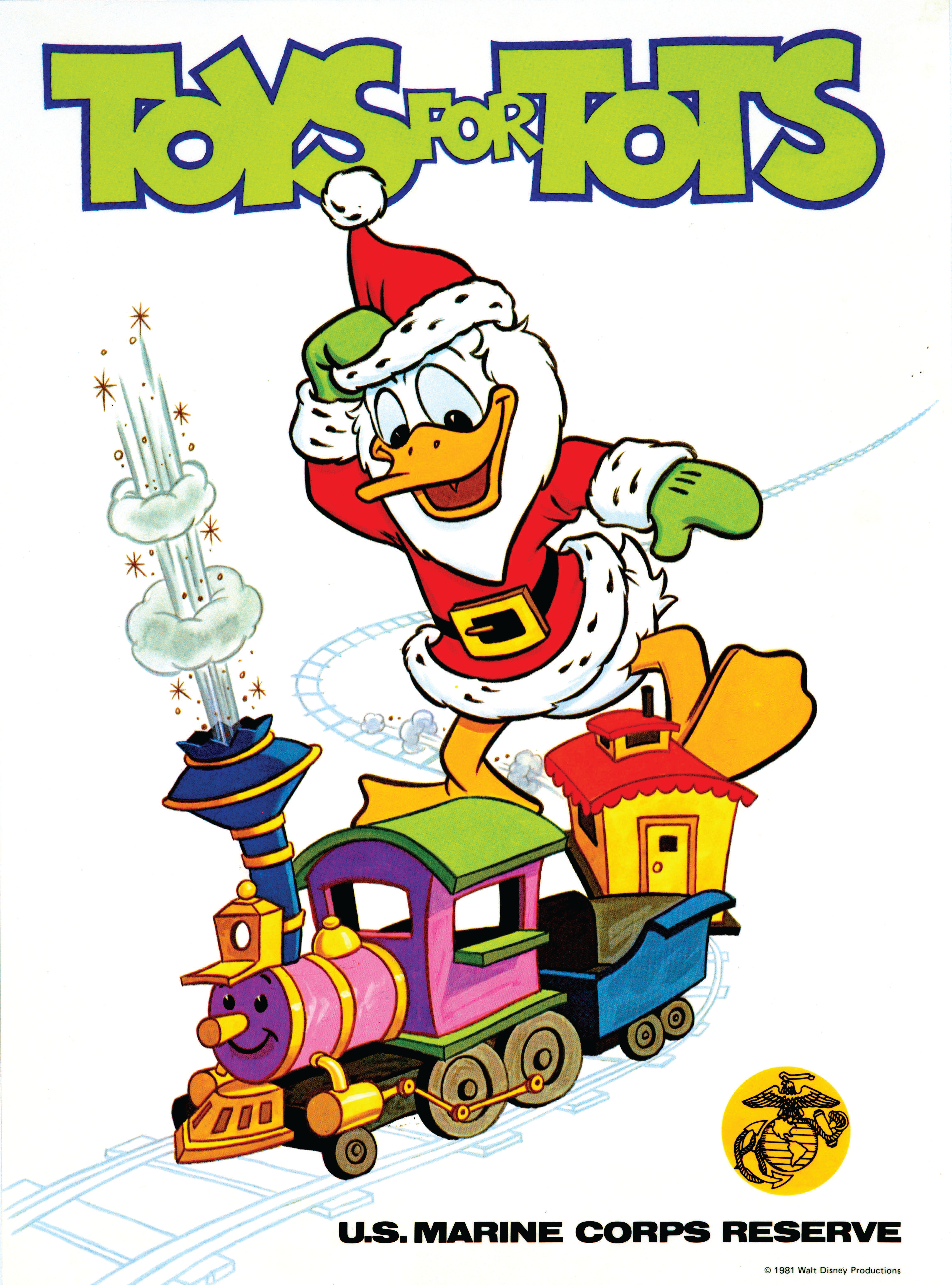 The Toys for Tots program and its posters have had a long association with cartoonists. The organization’s first poster was personally supervised by Walt Disney in 1948. Disney also designed the original Toys for Tots logo featuring a toy train. Over the years, Toys for Tots posters have featured numerous cartoon characters, including Daffy Duck, Bugs Bunny, Sylvester the Cat, Wile E. Coyote and the Road Runner, as well as Hank Ketcham’s Dennis the Menace and his dog, Ruff.