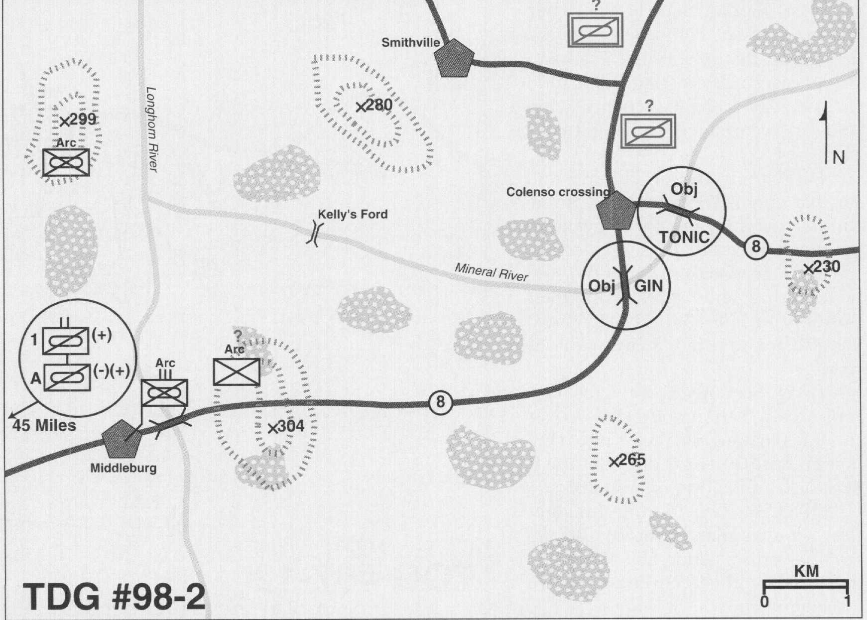 You are the commander of Company A, 1st Light Armored Reconnaissance Battalion, currently assembled about 45 miles west of Middleburg. Your unit is part of I Marine Expeditionary Force (Forward), which is supporting Arconian defense forces in resisting an invasion from Baltonia, its neighbor to the east. Reinforced by infantry, tanks, and artillery, the battalion is ordered to secure at first light the two bridges near Colenso Crossing in order to facilitate the attack by follow-on mechanized forces east along Highway 8 to defeat Baltonian forces and restore the Arconian border.