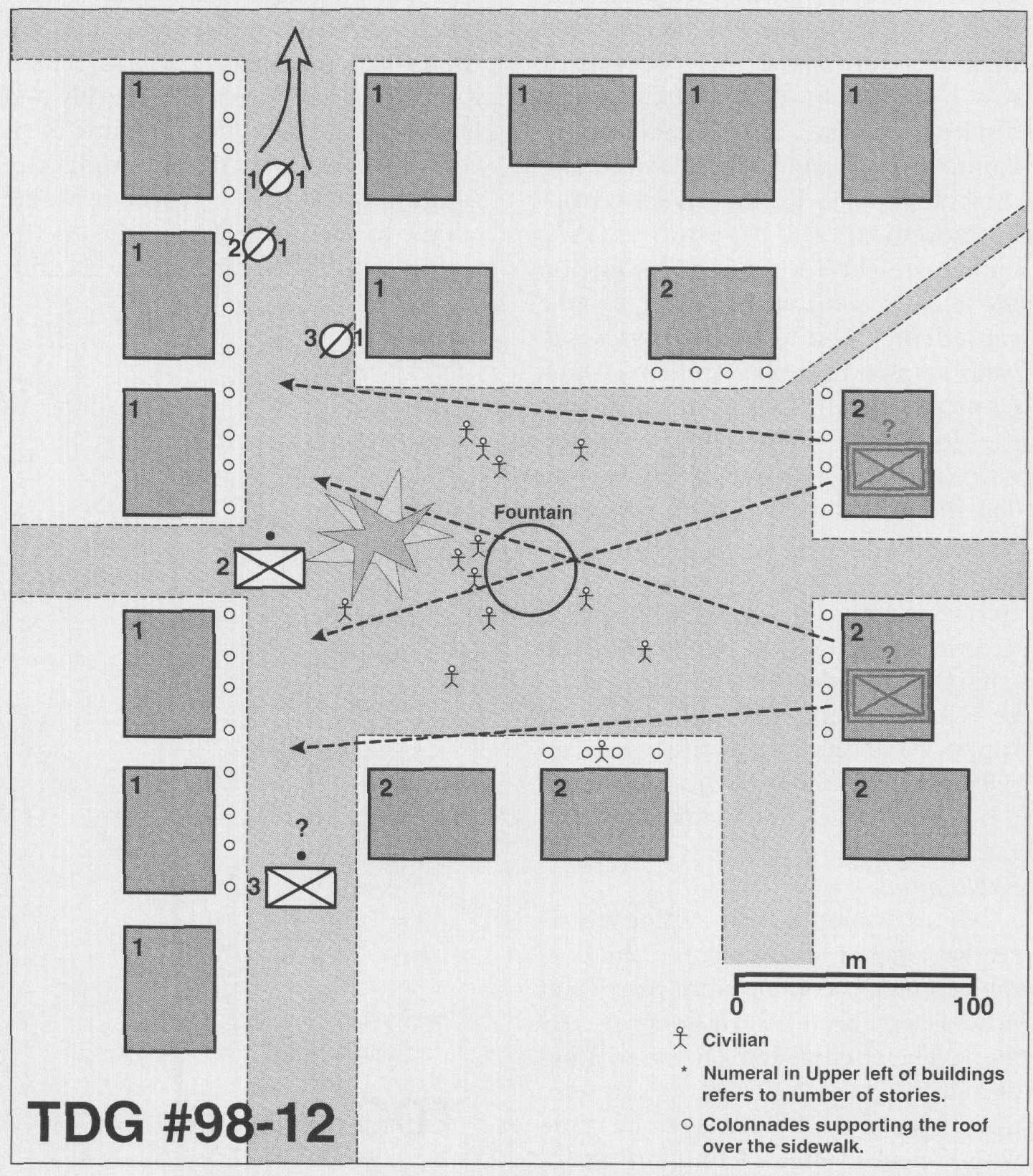 You and the platoon commander study the square for a few minutes. It seems clear, and he instructs you to move out. You move north across the west side of the square, staying close to the colonnaded facades in case you need cover. You have exited the north side of the square and are continuing on when you hear a loud explosion to your rear followed by gunfire. You run back to the entrance to the square to get a look. Smoke is clearing from some kind of explosive. 2d Squad and the platoon headquarters are pinned down in the square, taking heaDy automatic fire that ricochets off the fountain and the buildings. Some Marines have been hit. From your position with your 3d Fire Team, you can't locate 3d Squad or the platoon sergeant farther to the rear. You cannot tell if they are in the square or still south of it; you suspect the latter. You don't know how they are reacting to the fire. You peer quickly around the corner of a building. The fire seems to be coming from two two-story buildings on the east side of the square a couple hundred meters away. You can't tell if the fire is coming from both buildings or only one. It seems to be coming at least from the second story, but maybe from the ground floor as well. Civilians are screaming and hiding behind the fountain and in doorways around the square. A handful lay still in the square, apparently hit. From the square you hear calls for "Corpsman up!" What do you do?