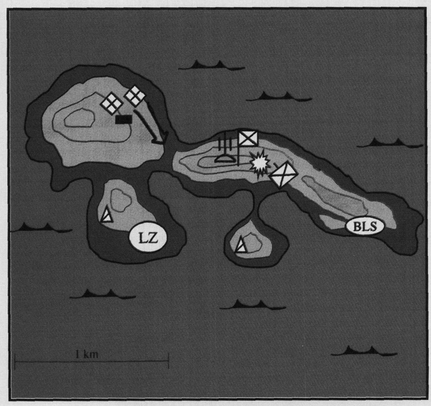 As the company maneuvers into position for its assault on the enemy CP, your lead platoon stumbles upon a fire team-sized security patrol. Fires are immediately exchanged, and the element of surprise is lost. The Ist Platoon commander reports that he has two men down, and he is also receiving small arms fire from the hilltop to his front. Before you issue any orders to your element leaders, the reconnaissance and surveillance team on the west side of the island reports that a column of armed smugglers is moving generally southeast toward the CP, perhaps to reinforce the headquarters. As you glance at your watch, you realize that the Baklavarian heliborne force is scheduled to land in the landing zone in less than 20 minutes. What do you do, Captain?
