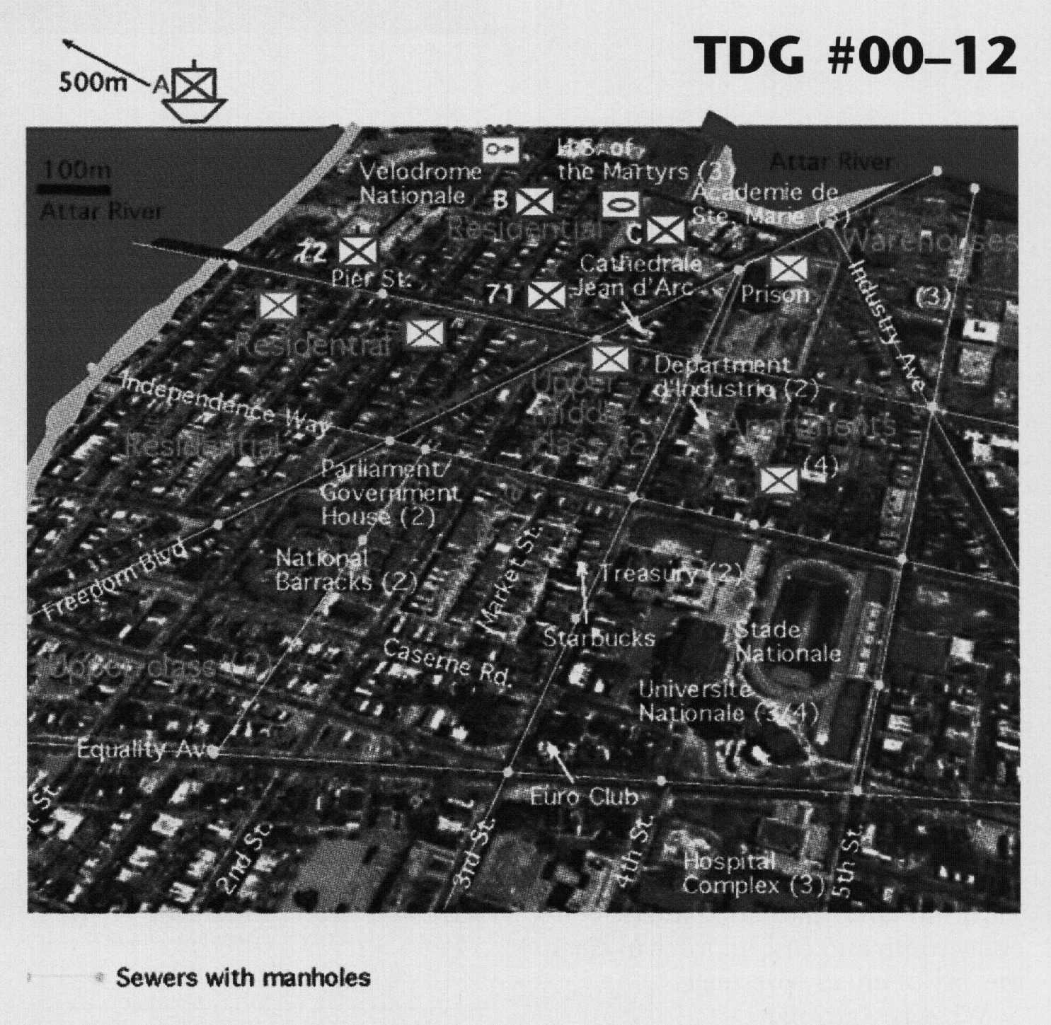 You are the commander of Ist Battalion, 8th Marines. For months your battalion has been fighting guerrillas in the African countryside. The enemy has launched a surprise offensive to capture several key cities, including the former colonial capital of Tinti along the Attar River. The Attar splits the city in two, with the smaller French quarter located in a bend in the wide river, and the larger, indigenous section located across the river to the north and west. The French section is characterized by typical European colonial architecture: mostly one- and two-story brick and concrete buildings with thick walls, walled yards, tropical gardens, and tree-lined boulevards. From the river there is a 12-foot sloped embankment, and then the terrain slopes gently uphill another 50 meters to the high point at the Universite Nationale. The named and numbered streets are European-style boulevards about 30-35 meters wide. Other streets are mostly narrow lanes. An underground sewer system remains from colonial days.