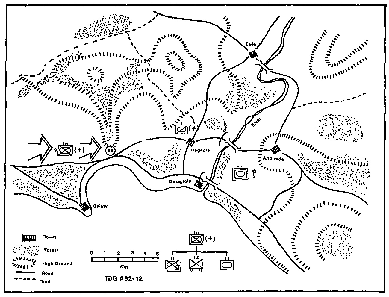 Intelligence indicates that the enemy has fallen back through Tragedia and Garagiola and is preparing positions along the Garagiola River, which has steep banks that make it impassible to any vehicles. As your leading mechanized battalion approaches Checkpoint 68, you receive a report of enemy light-armored infantry (with antitank missiles) at Tragedia. Within the next half hour your regiment will be engaged. What are your orders, Colonel?