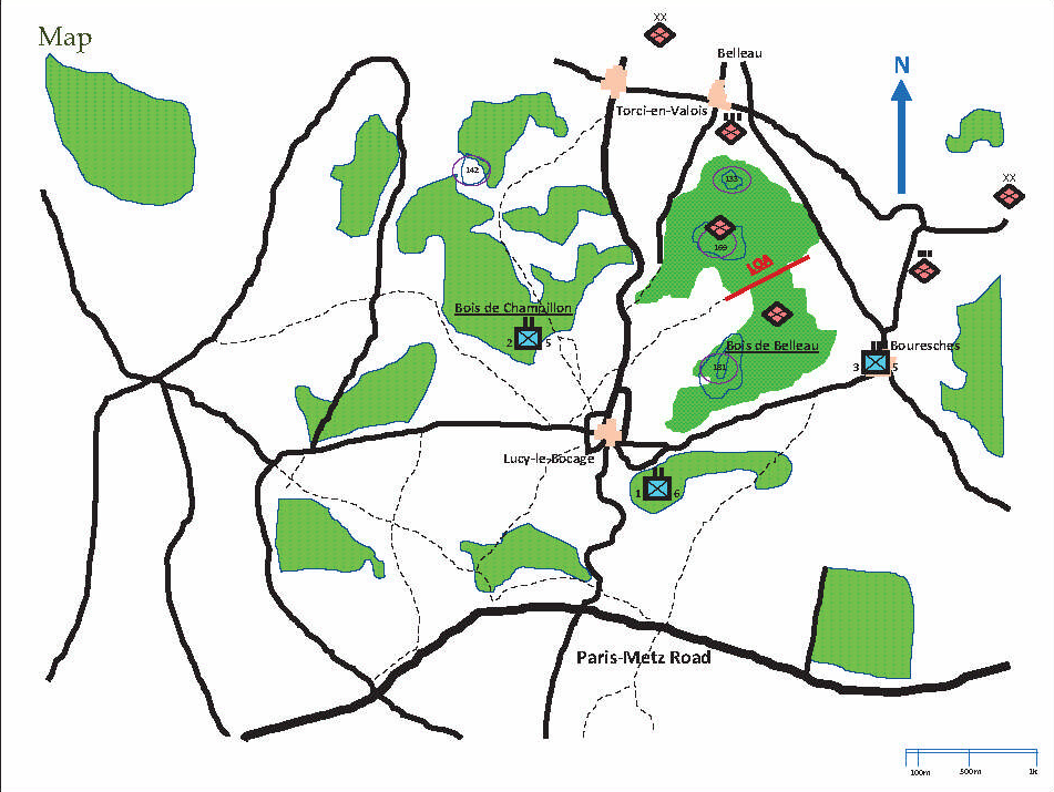 You are the CO, 1st Bn, 6th Marines, 4th Marine Brigade, 2d Infantry Division, American Expeditionary Forces. Your battalion is currently located to the southeast of Lucy-de-Bocage. During the Battle of Château-Thierry on 6 June 1918, the 4th Marine Brigade seized Hill 142 and the town of Bouresches and established a foothold in the southern portion of Belleau Wood. The clearing of Belleau Wood is now essential in preventing harassing fire and in ensuring the overall security of the Paris-Metz highway—the main Allied line of communication. With outcropping boulders, dense foliage, and steep, rolling terrain, Belleau Wood offers the perfect defensive position and is currently occupied by the German Army with elements of the 461st Infantry Regiment, 237th Division in the north and the 40th Fusiliers Regiment, 28th Division in the south. Operations conducted by Marines from 6 through 9 June have shown that the Germans are armed with heavy and light machine guns and are well supported with artillery fires. German artillery units have been known to utilize chemical munitions. The enemy has regimental-sized elements to the north and east of Belleau Wood that can make a movement to reinforce during the night.