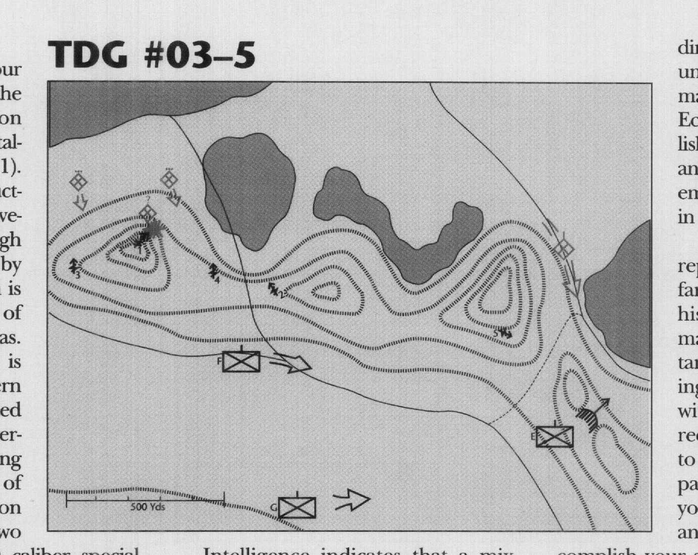 Just then Hunter 3 reports a platoon of infantry advancing toward his position, approximately 300 meters distant. Hunter 3 is requesting mortar fire to deal with this threat. His fire request has been denied to facilitate Echo Company's ambush. Just as you are analyzing time and space factors to accomplish your screen mission in light of the enemy proximity to the ridge, the silence is shattered by rapid fire from Hunter l's M82A3 SASR and M249 squad automatic weapon (SAW). "Infantry, technicals, 100 yards my pos . breaking contact now!" Simultaneously, Hunter 4 reports approximately 30 to 40 men approaching their position from the northwest, 300 yards away.