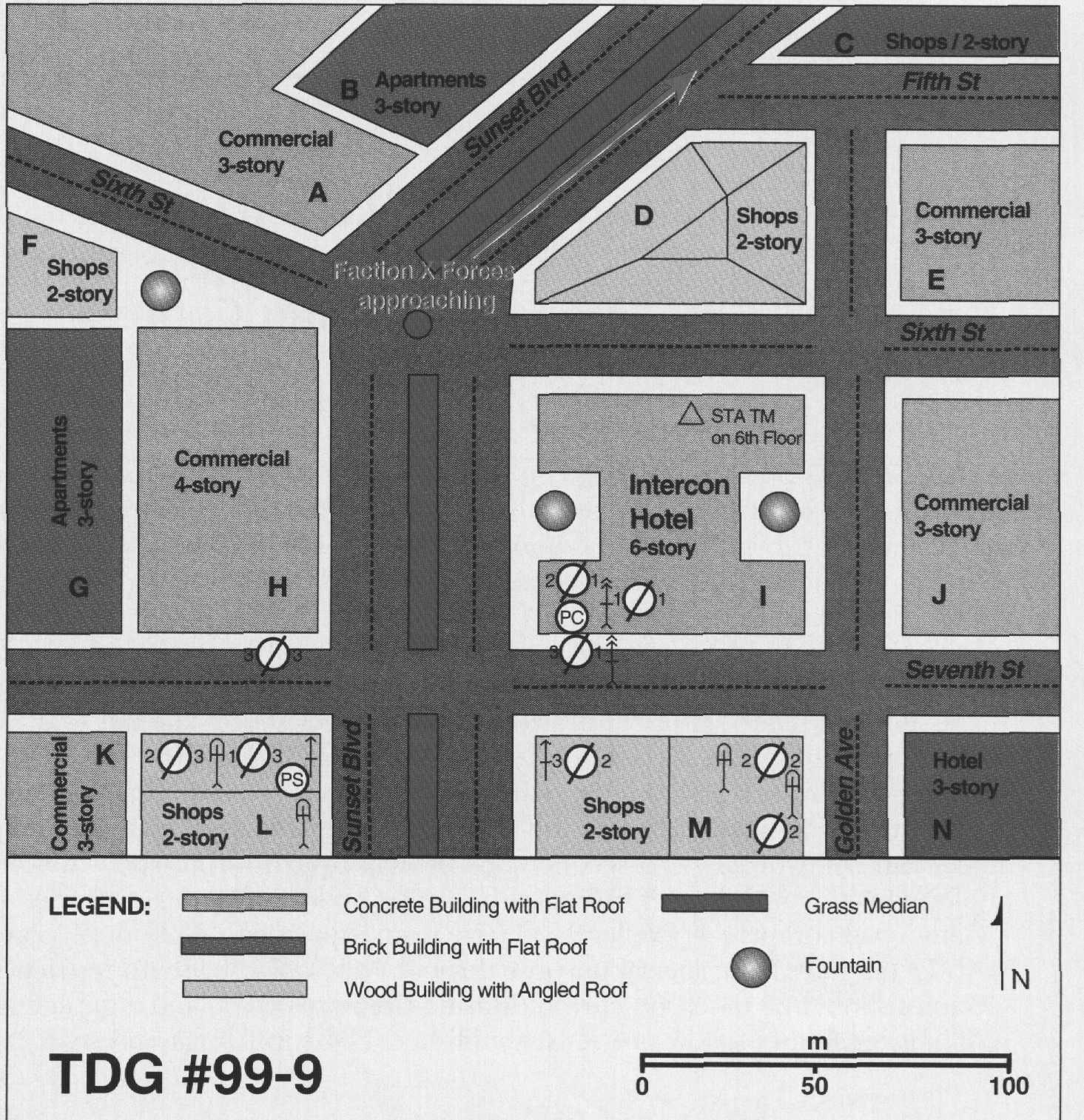 As you ponder the ambiguity of the last sentence of your frag order, you quickly maneuver your platoon north. As you near the Intercon Hotel, the scene before you is one of chaos. People are fleeing the streets. Several shout, "Tanks!" as they run by and point north up Sunset Blvd. You put your platoon sergeant and 3d Squad into building L (see map) and 2d Squad into M while you move with 1st Squad into the bottom floor of the Intercon. As you enter, you see about 20 foreigners and locals in the lobby. They are all very excited and anxious. At least two are obviously reporters, and their cameramen are positioned in anticipation of the tanks rolling by on Sunset Blvd.