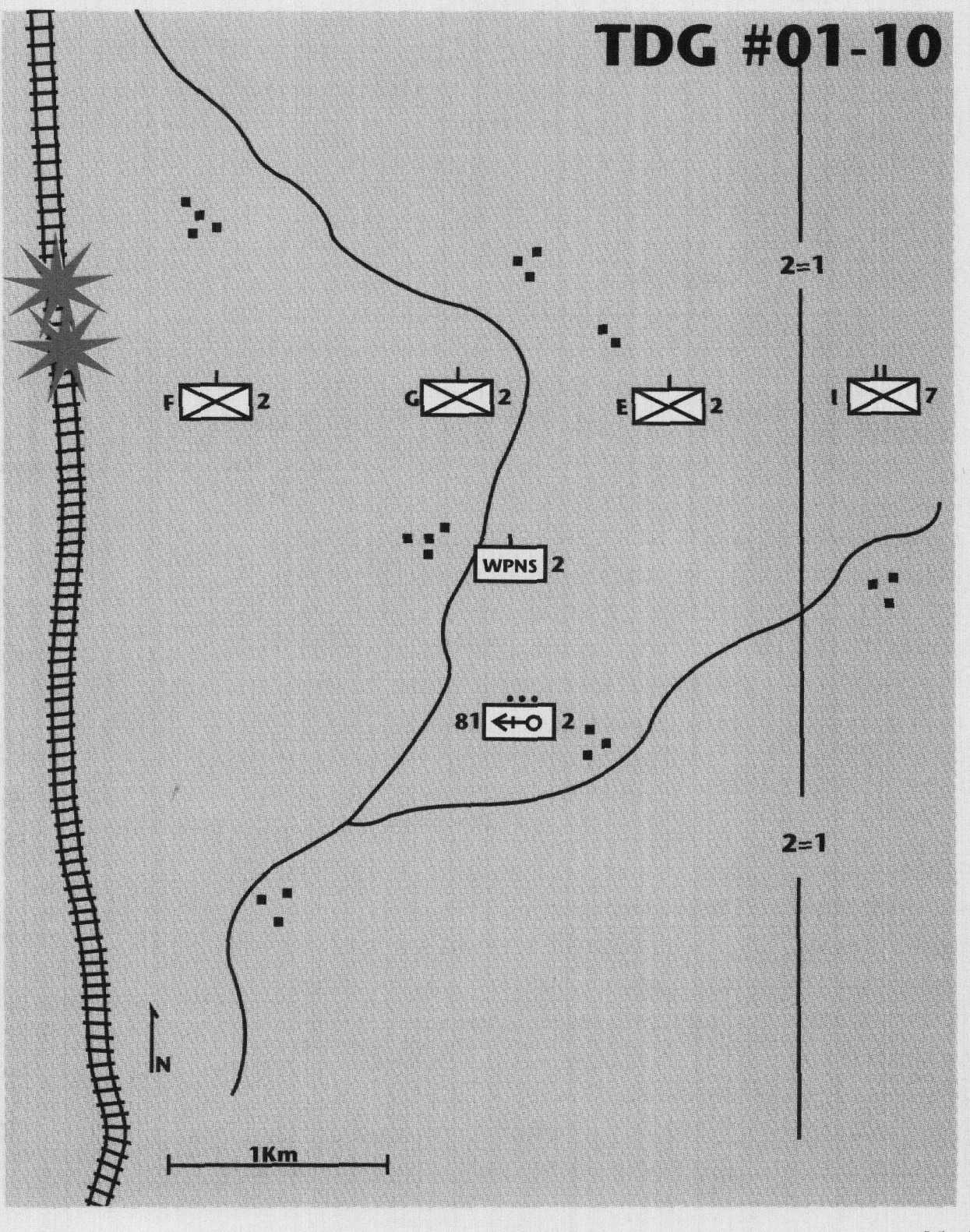 The battalion has been moving forward at the expected pace with no civilian contacts, even though some small villages have been passed, when Fox's flank security walks up on a well-concealed, reinforced, company-sized ambush behind the railroad embankment. Action is immediate with very heavy firing from the enemy and Fox Company. Fox's CO reports that he is taking intense machinegun and rocket propelled grenade fire; he has turned all three platoons into the ambush and is assaulting the position. In some areas his men have crossed over the railroad embankment. Contact is close. Casualties are light.