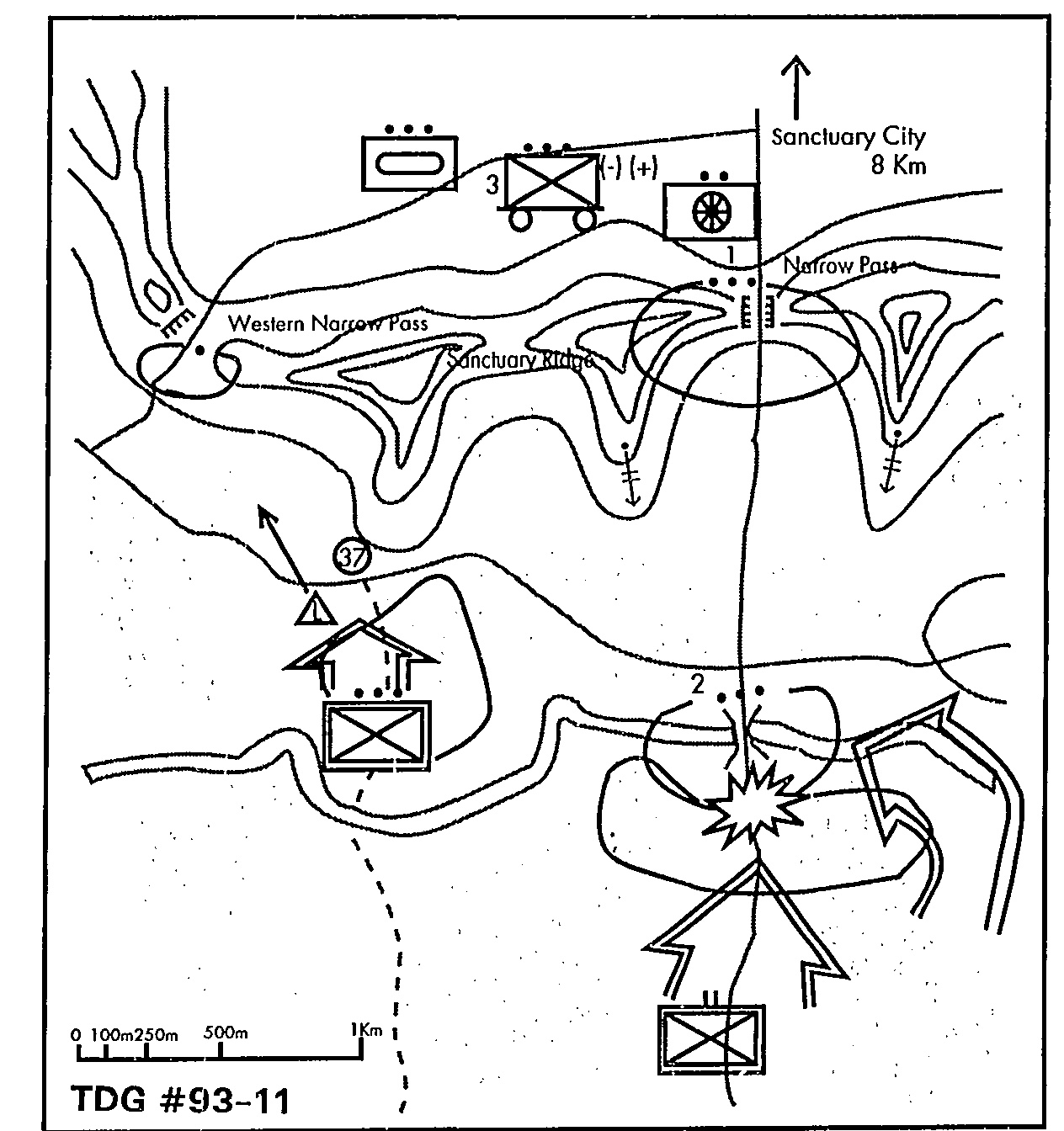 You are the commander of Company H, 2d Battalion, 4th Marines. You are reinforced with two heavy machinegun squads (each squad consisting of an M2HB caliber .50 machinegun and a Mk19 automatic 40mm grenade launcher), a tank platoon, a section of Dragons (attached to your platoons), and enough trucks to carry your company. The enemy has landed a helicopterborne force at Sanctuary City to the north, which friendly forces have surrounded. The enemy is attacking north with ground forces to link up with its helicopterborne force, whose situation is becoming desperate. Your mission is to halt or delay the enemy relief attack for as long as possible in the vicinity of Narrow Pass. The terrain south of Sanctuary Ridge is generally rugged and undeveloped with thick vegetation and severe relief. The enemy consists of infantry with a limited numbers of tanks.
