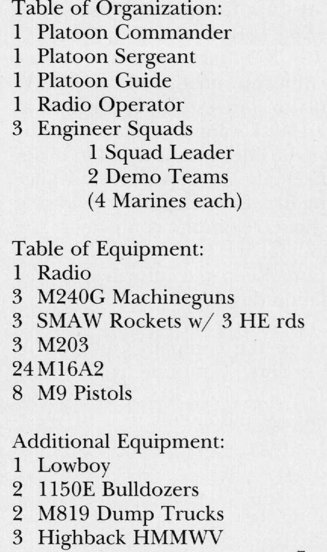 You are the platoon commander of 2d Platoon, Company B, 2d Combat Engineer Battalion. You arrived in the country of Devastation 3 days ago. As part of Battalion Landing Team (BLT) 2/6, you are assisting the local government in earthquake relief by providing a secure environment and repairing serious damage.