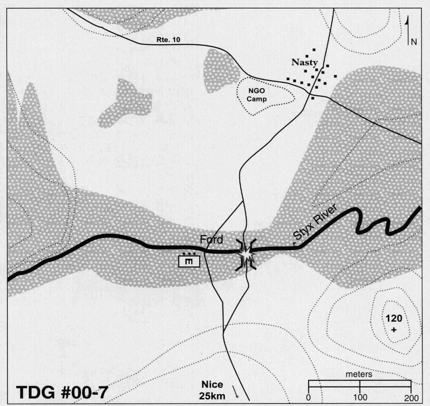 Toward the late afternoon, you are visited by a group of Frenchmen from the NGO camp. They are very concerned about a report that the insurgents will attack the village within the hour in order to capture the NGO camp and supplies, and secure control of the ford site. The Frenchmen report that there are 25 other British and French aid workers at the camp. They have two 2 1/2-ton trucks and about 18 tons of food and medical supplies.