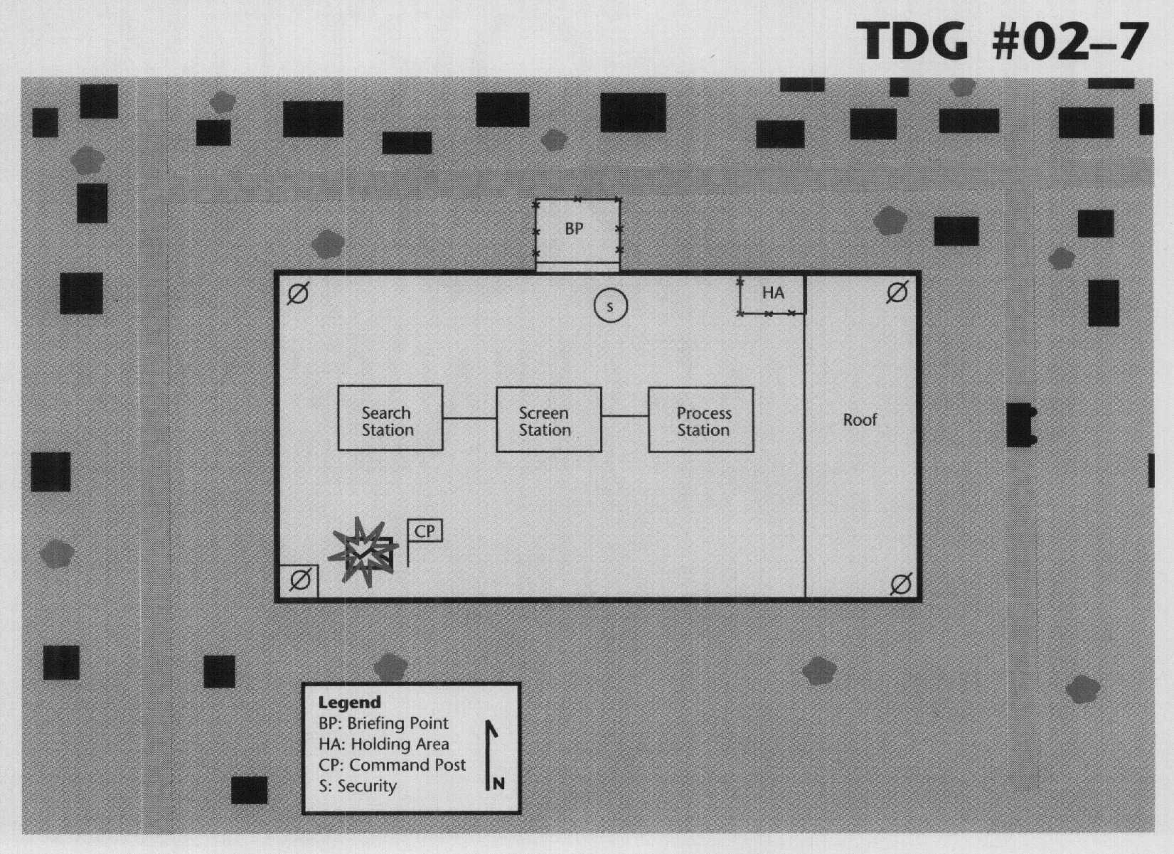 The briefing point is located at the entrance to the compound. The ECC team has set up its security, search, and screening/processing stations in the compound. Staging/embark is located on the second floor of the building. There is a MEU interrogation area located on the first floor of the building. The medical station is also located on the first floor of the building in a separate room. There is a temporary holding area surrounded by barbed wire in the northeast corner of the compound with four people detained in it.