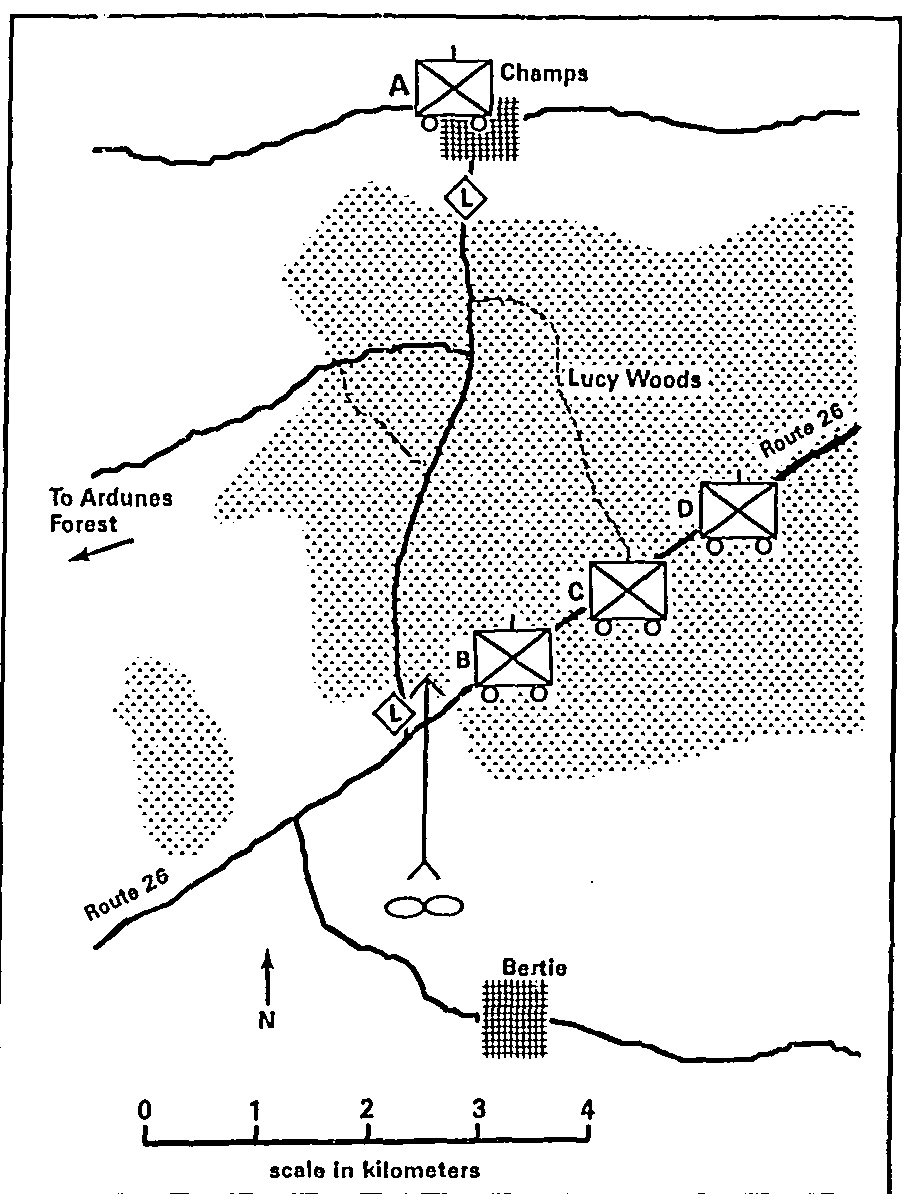 You are en route to intercept the enemy in Ardunes Forest. To protect the north flank of your move through Lucy Woods (southwest, along Route 26), you have posted Company A (reinforced with Dragons and heavy machineguns) in the village of Champs. The rest of your battalion-with Dragons, heavy machineguns, and 81 mm mortars attached to the rifle companies-is in column. Accompanied by an artillery liaison officer, your air liaison officer, and a forward observer from the mortar platoon, you are riding with Company B at the head of the column.