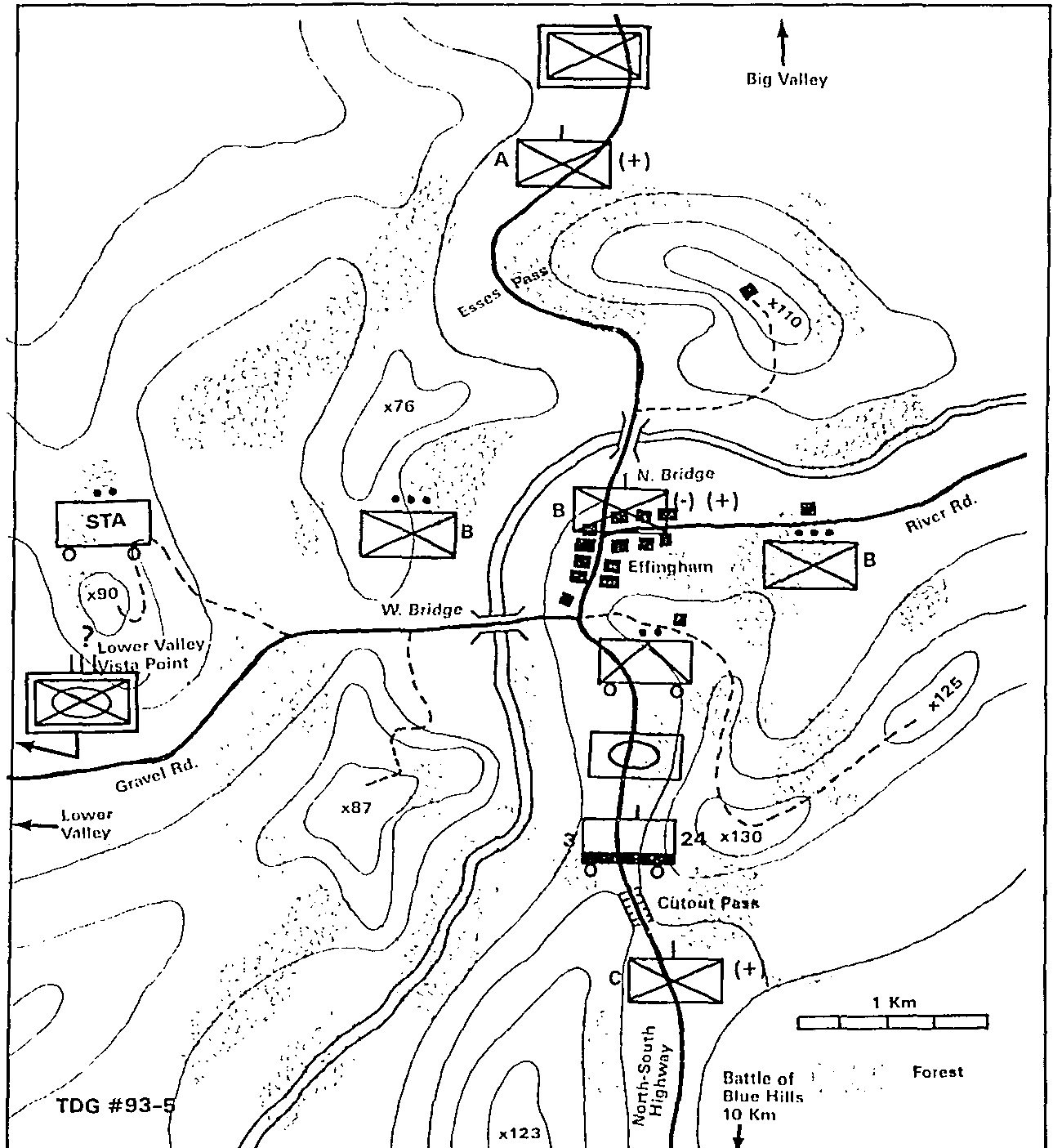 The leading elements of Company A. debauching from Esses Pass on the two-lane North-South Highway, report an enemy force to their front: ragtag and ill-equipped, it is clearly the force you have been pursuing, but battalion strength or greater and apparently reassembled and preparing to make a stand. Company B is in Effingham proper, and has pushed platoons out to either flank. The tank company and TOWs are on the highway south of Effingham. The combat train is negotiating the narrow Cutout Pass, and Company C is south of the pass on the highway. You send your Surveillance and Target Acquisition (STA) Platoon west on Gravel Road to Lower Valley Vista Point to make visual contact with 4th Marines as instructed. Your first hint of trouble is a fire mission from STA on the conduct of fire net describing a target as "tanks and troops on the road-battalion strength." Immediately, you receive the following urgent message from STA on BN TAC 1: Tanks-tanks-tanks; I count 20-25 T72s-I say again T-72s-with BTR-60s, heading cast on Gravel Road approaching Vista Point-one click west. The valley is full of armor and troops. Infantry on the flanks moving through the woods-cannot make out number-estimate battalion easy. Taking automatic fire-must withdraw.
