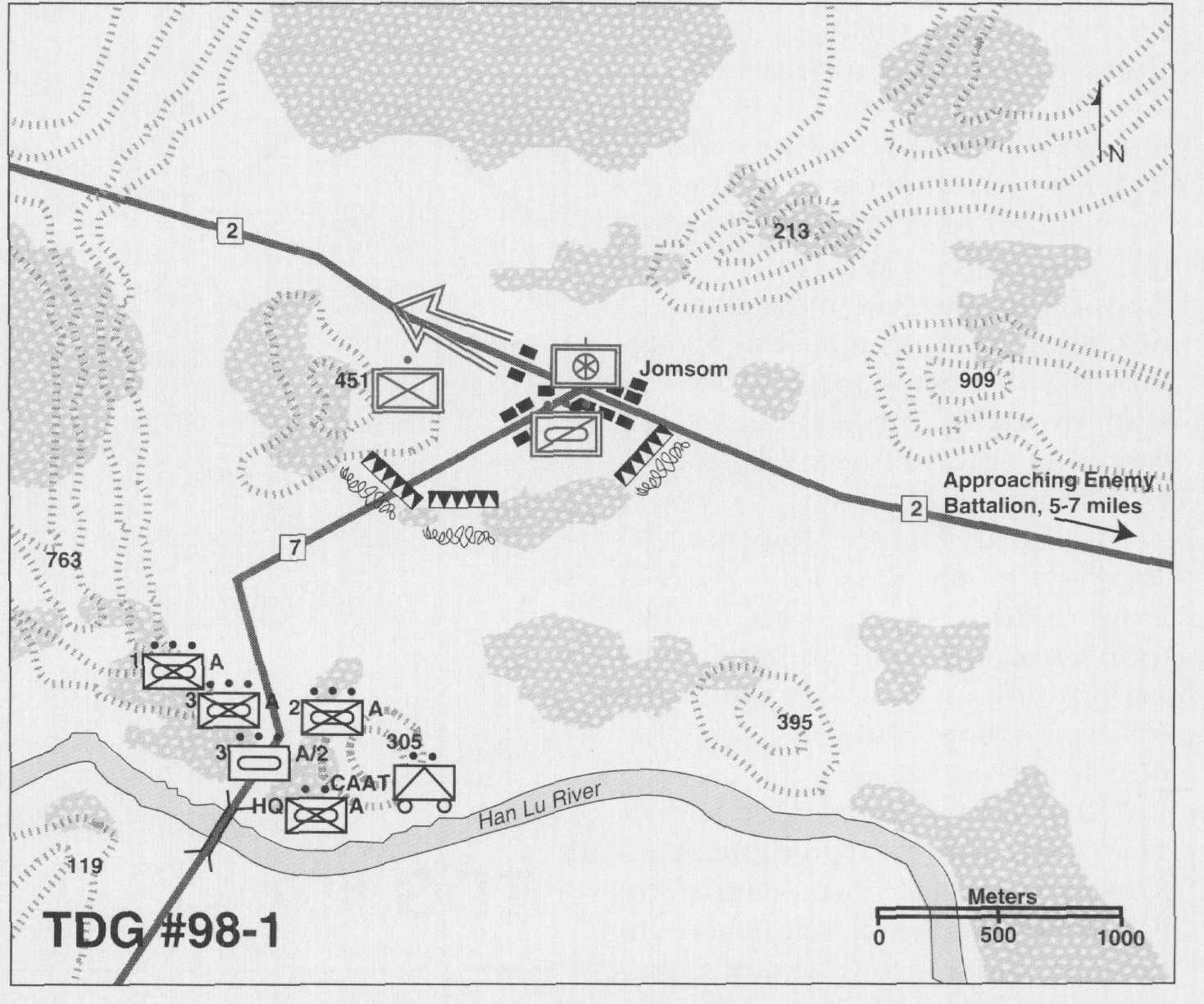 Bravo and Charlie are engaged with an enemy mechanized battalion about 10 clicks to your east. The enemy seems to be fighting a delaying action west toward Jomsom. You are in a position to cut off his only avenue of retreat. I expect him to break and run at any time. Your mission is to ensure that no enemy forces be allowed to escape west of Jomsom. When the enemy main body commits to its retreat, you will become the main effort and receive priority of fires. [The battalion has one artillery battery, a section of Cobras and two sections of Harriers in direct support.] In addition, I've already sent you a tank platoon and CA-AT [combined antiarmor team].