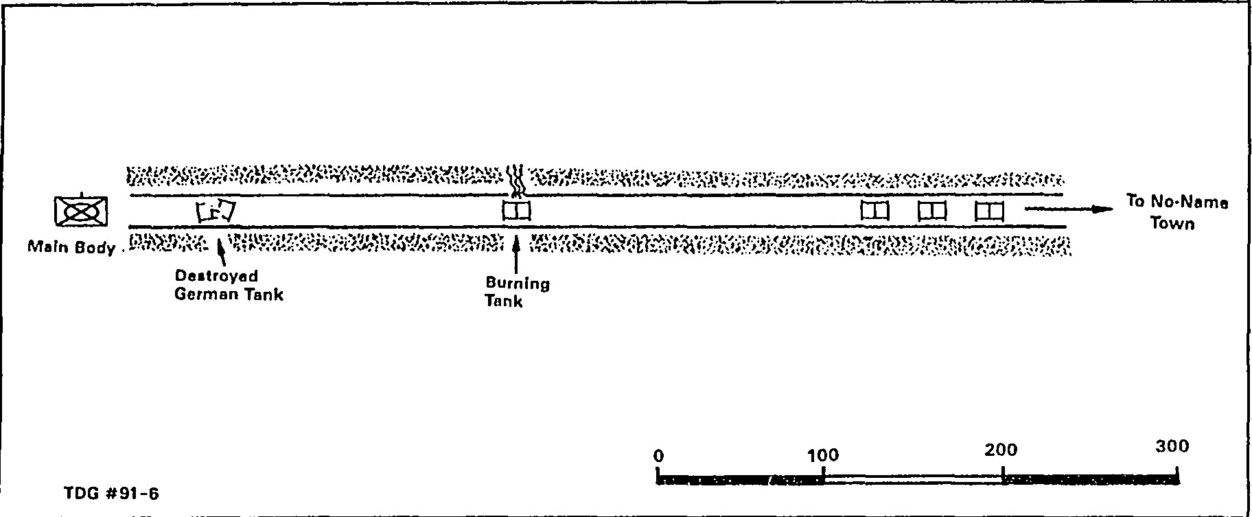 You deploy your troops in ditches along the road. There are now only 3 tanks, 22 riflemen (each with 3 or 4 grenades), and 2 Browning automatic riflemen left in your mini task force trapped between the burning tank and the town. You do not know what happened to the eight men from your platoon who were riding on that tank. Since the main body is stalled a quarter mile to the rear, the company commander orders you to rejoin the main force. You wonder how to do this. It is physically impossible for the tanks to leave the road, which is still partly lit by the burning tank. Your platoon can squeeze through the hedgerows into the fields beyond, but that is where the Germans are. Although you can only see a few Germans near the burning tank, you believe that you are surrounded by the enemy. The Germans can fire through the hedgerow, but only with limited accuracy. They can also fire over the hedgerows, but must expose themselves to do so. Some of your men have been in combat for only a few days and are near panic. You outrank the tank commander, who is another lieutenant. What are your orders?
