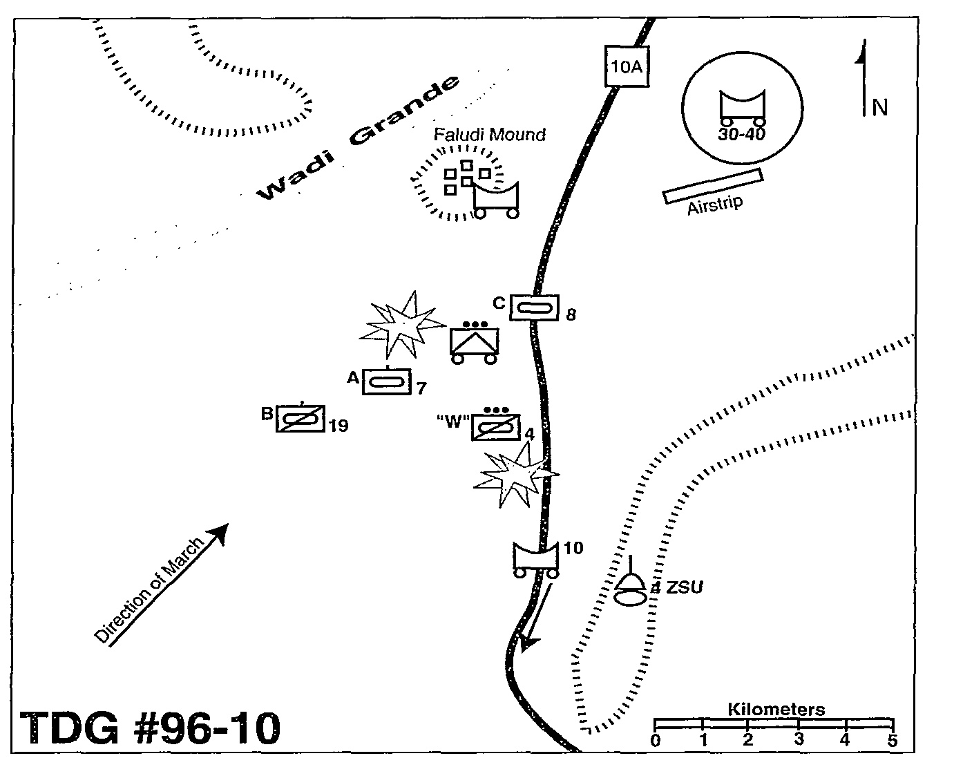 You are thinking you might actually get some rest tonight when you receive instructions from division: "A mixed enemy force of tanks and mech-estimated battalion strength, but that's probably exaggerated-was reported to have overrun the Faludi airstrip about an hour ago. Attack to destroy." You ask for more information, but that is all that is known. You remind division of your ammunition situation and the fact that you only have 15 tanks, and the reply is: "Roger; attack at the earliest opportunity."