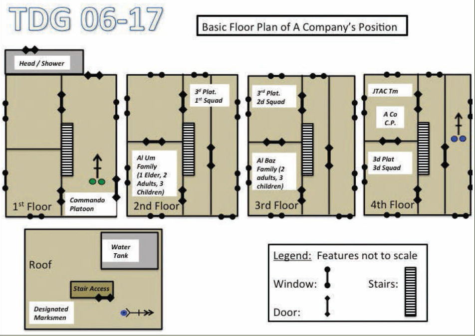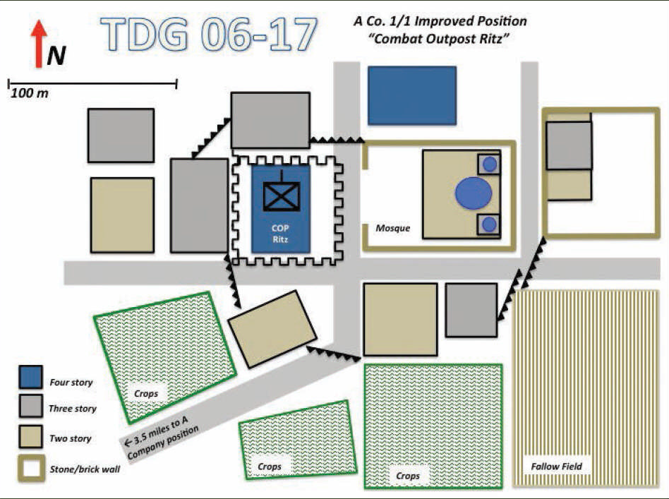 Your command—A Company, 1st Battalion, 1st Marines, aka “Red Death”—has been occupying and improving a combat outpost in “the Ritz,” a four-story building west of the Al Mumeet Mosque, for six weeks. You are still reinforced with an MUGA Commando Platoon, and both your Marines and the commandos have been regularly rotating between the company’s sector of the battalion FOB and the outpost for the last four weeks, spending two weeks in each position. The route between positions is patrolled by elements of the battalion and LAR, and it is under near-continuous observation by rotary-wing aircraft and scout snipers.