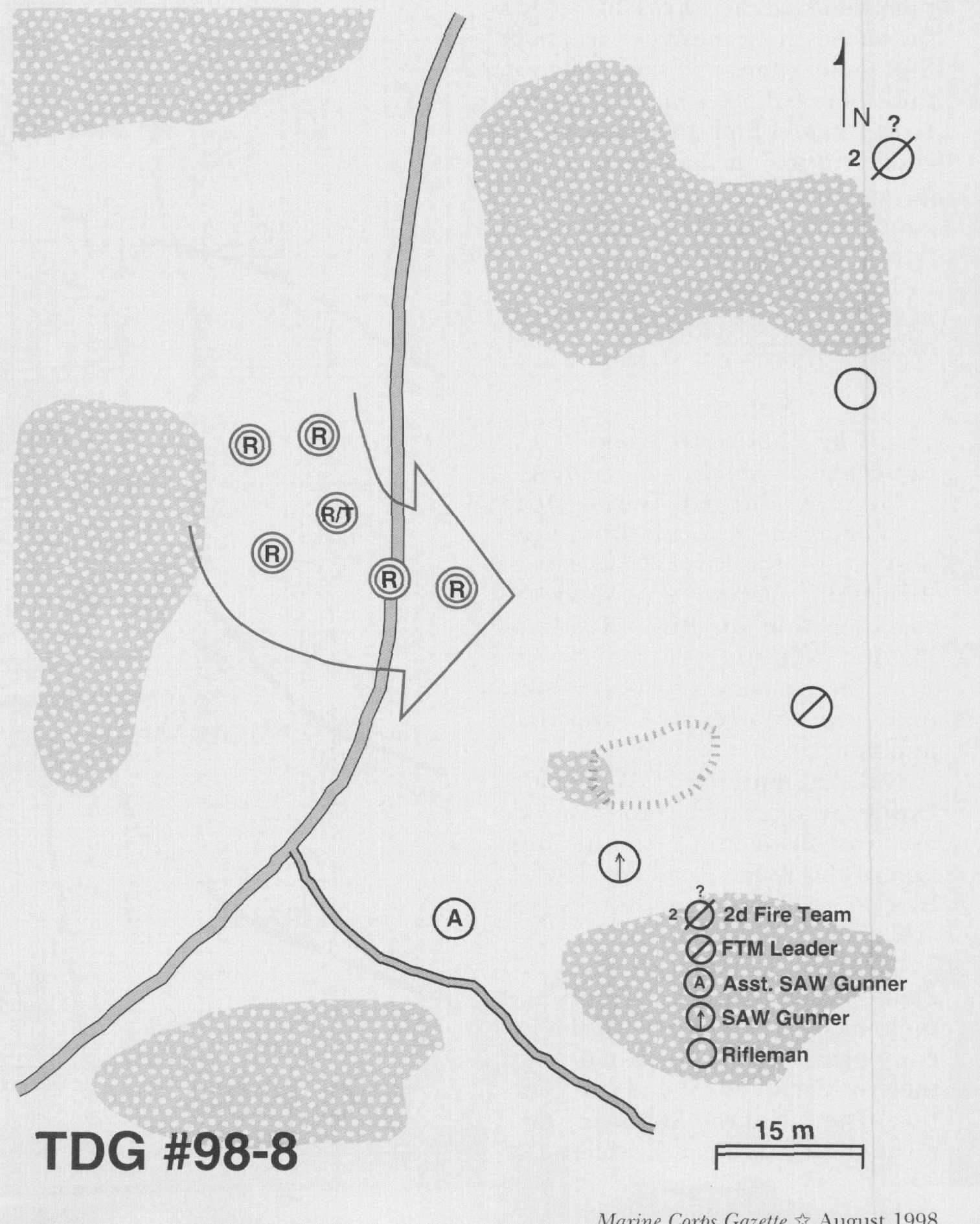 In a time limit of 1 minute, describe what actions you will take and by what means. Then provide a sketch of your actions and the rationale behind them. Submit your solution to the Marine Corps Gazette, TDG #98-8, P.O. Box 1775, Quantico, VA 22134 or fax (703) 640-0823.