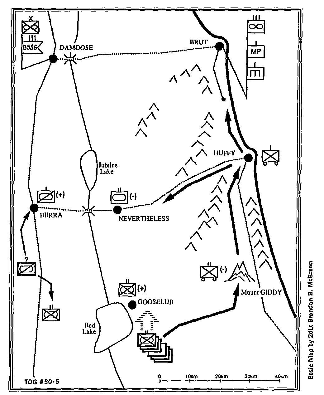 As it turns out, however, the enemy buildup in the south is actually a wellexecuted deception. Instead of striking Gooselub, the enemy attacks in strength at Mount Giddy supported by massed offensive airpower. The GCE commander also reports that the light armored company and mechanized battalion on the right flank are under attack but holding their own, as is the battalion at Gooselub. But he reports that he cannot make contact with the motorized battalion at Mount Giddy, which apparently has been overrun. Within 12 hours scattered situation reports indicate that enemy mechanized and armored forces have reached Nevertheless, where they are being engaged by the reserve tank battalion, and are beginning to bypass Huffy headed north along the littoral plain.