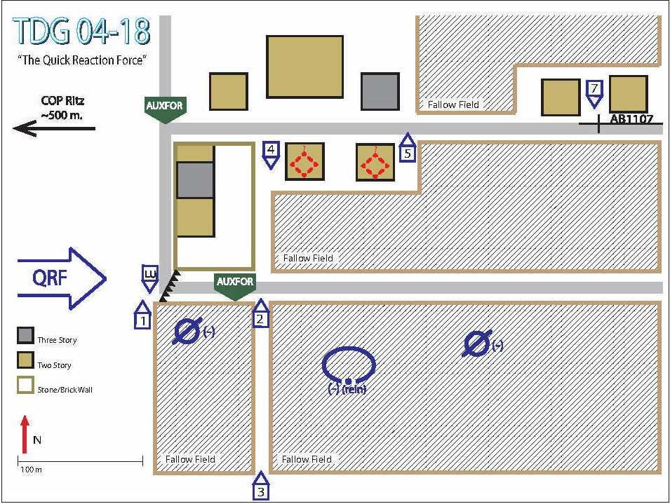 As you rapidly supervise to ensure the QRF is prepared to depart COP Ritz, your company commander directs you to link up with the patrol in the vicinity of checkpoint one, assess the situation, report back, and, on order, attack to clear the buildings between checkpoints four and five. You have five minutes remaining to complete your initial plan and issue a fragmentary order (FRAGO) to the QRF for link-up with the patrol and execution of your on-order mission.