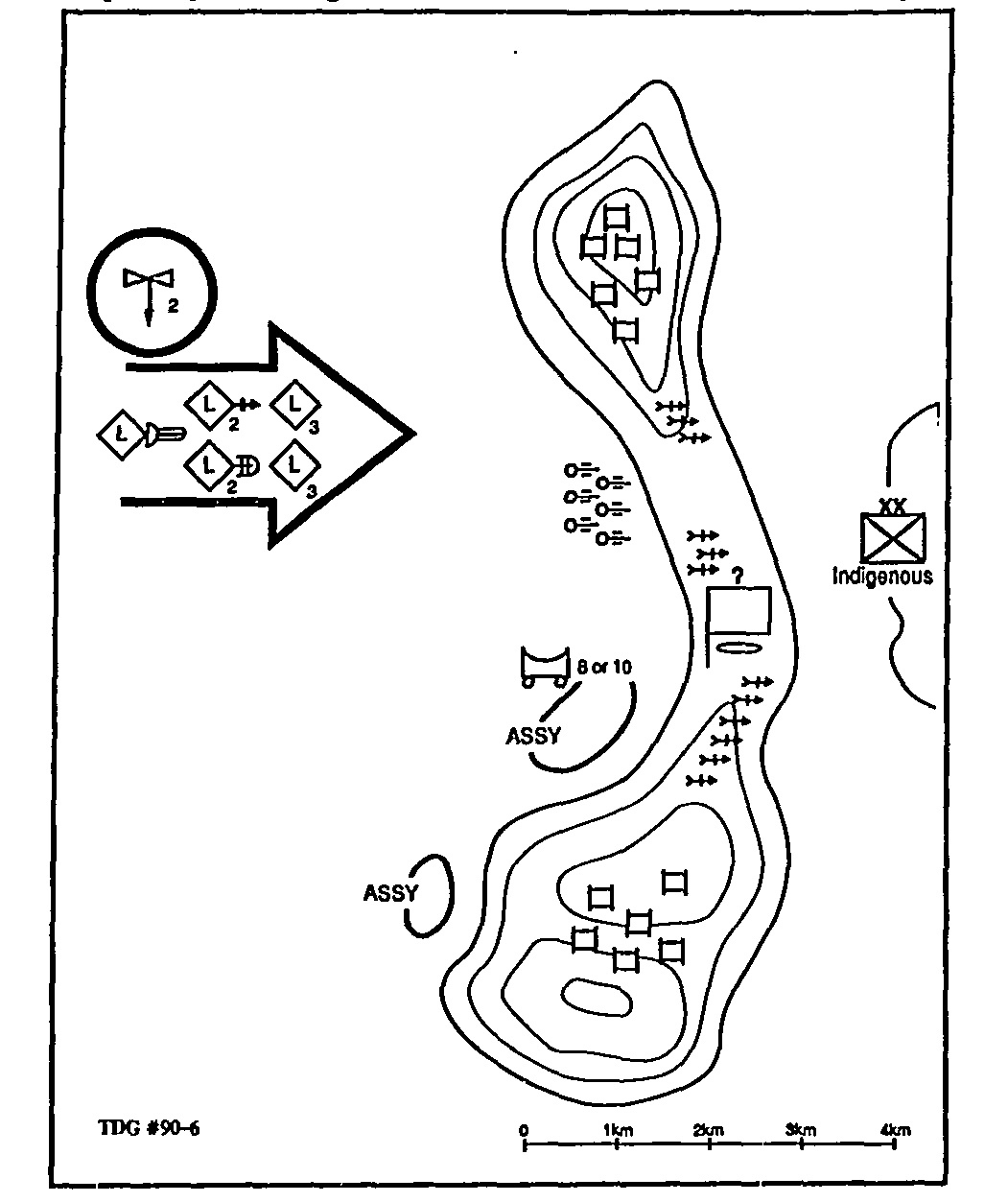 We're here. [Pointing on the map with a pencil.] The Indigenous Division is here. [Another jab some 25 miles to the east.] The enemy is here on Gazebo Ridge, in between, giving the Indigenous boys a beating. Our division has orders to relieve the pressure on the Indigenous Division. Unfortunately, fuel is low. Division has enough for a limited operation-a reconnaissance in force-which naturally will be us. We will make a raid directly into the enemy rear while the rest of the division pulls back for replenishment. First sergeant, your boys will be on the right; I can give you a section of two TOW Cobras in direct support. Bravo on the left; Charlie and Delta are reserves, on the right and left respectively. We'll have one battery of self-propelled arty in direct support.